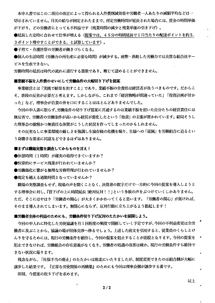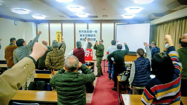 今年度総括・次年度方針・新役員体制などが承認され、「団結ガンバロー」三唱を行う佐藤執行委員長
